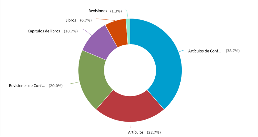 La distribución de los documentos por tipo indica que los artículos de conferencias constituyen el 38.7% de la producción total, seguidos por los artículos de revistas con un 22.7%. Las revisiones de conferencias representan el 20%, mientras que los capítulos de libros y los libros completos constituyen el 10.7% y el 6.7% respectivamente. Las revisiones tienen la menor representación con un 1.3%.