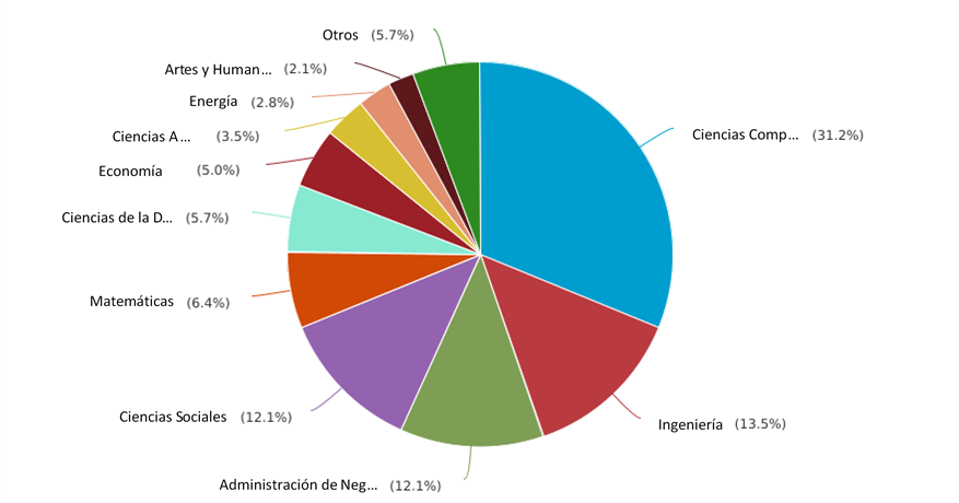 En cuanto a la distribución por área temática, la ciencia computacional lidera con el 31.2% de los documentos, seguida por ingeniería con un 13.5%. Las áreas de administración de negocios y ciencias sociales tienen una representación significativa con un 12.1% cada una. Otras áreas relevantes incluyen matemáticas (6.4%), ciencias de la decisión (5.7%), economía (5.0%), y ciencias ambientales (3.5%).