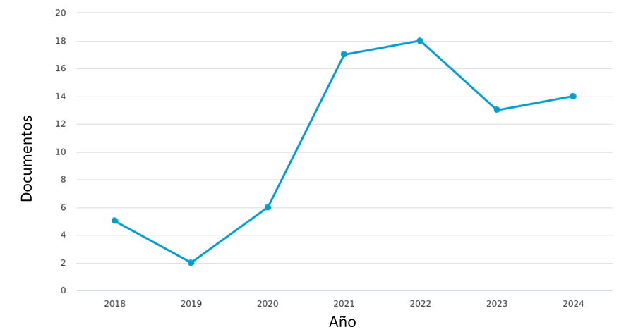 En la figura 5 se muestra el análisis temporal en donde se aprecia un incremento constante en la producción de documentos desde 2019, alcanzando un pico en 2022 con 18 documentos. Sin embargo, se observa una disminución en 2023, con una estabilización en 2024.