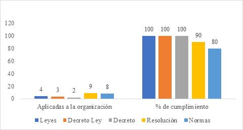 En la organización se evidencia el conocimiento de las obligaciones legales ambientales y cómo interactúan con el Sistema de Gestión Ambiental, existe correspondencia con el criterio de cumplimiento de legislación de 90 a 100 % (figura 1); estado: en avance, según criterios de Miranda et al. (2018).