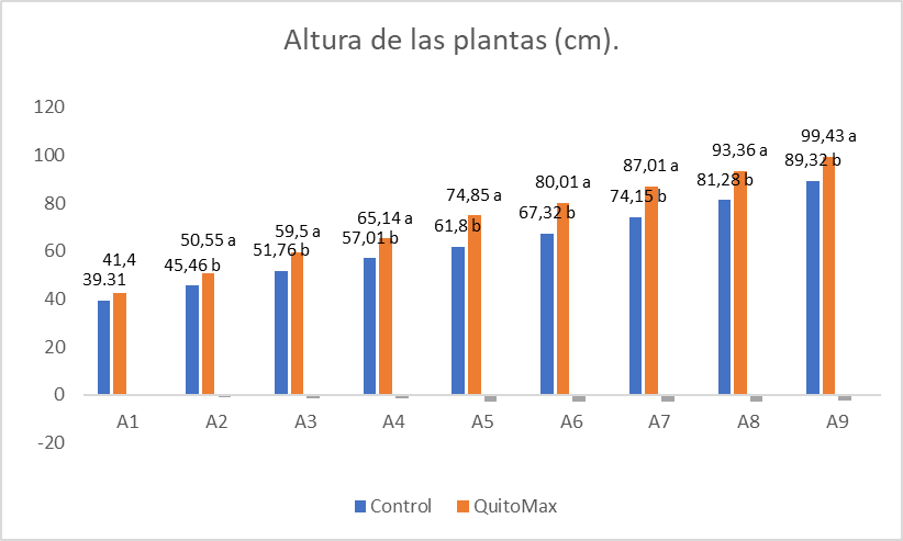 Al evaluar la altura de las plantas según aparece en la Gráfico 1, en el momento de la primera aplicación (3 meses después de la plantación) no existieron diferencias significativas entre los tratamientos Control y aplicación Quitomax®.