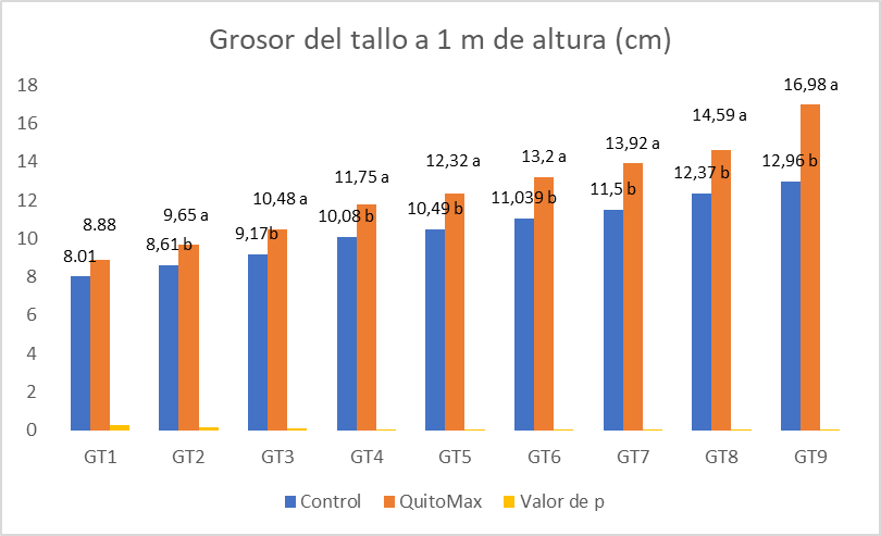 Con relación al diámetro del seudo tallo a un metro de altura de la base de la planta, al evaluar varios clones de plátano macho, Ventura (2010), reporta que el clon ‘Zanzibar’ fue el que presentó mayor valor, sin diferencias significativas respecto al clon ‘INIVIT PV 06 30’, pero sí con el resto de los clones evaluados, los valores reportados en su investigación son superiores a los obtenidos en esta experiencia, ya que los valores máximos se obtuvieron en el tratamiento con Quitomax® con rango entre 15,3 a 16,8 cm de diámetro del tallo a 1m de altura del seudo tallo.