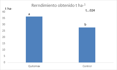 Al evaluar el rendimiento por hectárea obtenido, se observa que existieron diferencias significativas entre los valores de los tratamientos donde se aplicó Quitomax® y el resultado del tratamiento control con valores de 34,6 y 27,7 t ha-1 respectivamente. (gráfico 4)