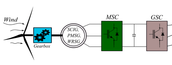 En cambio, los sistemas de tipo 4 emplean convertidores de frecuencia back-to-back de plena potencia, formados por un convertidor del lado de la máquina (MSC) y un convertidor del lado de la red (GSC). Esta configuración desacopla el generador de la red, lo que permite una mayor flexibilidad en el control de la velocidad y el funcionamiento. Permite a la turbina funcionar a su velocidad aerodinámica óptima, produciendo una salida de CA "salvaje" del generador que puede transformarse en una frecuencia compatible con la red. Además, el convertidor de plena potencia elimina la necesidad de una caja de engranajes, ya que la turbina puede funcionar a velocidades de rotación más bajas. Los generadores utilizados en los sistemas de tipo 4 pueden variar e incluyen máquinas síncronas de rotor bobinado (WRSG), generadores síncronos de imanes permanentes (PMSG), máquinas de inducción de jaula de ardilla (SCIG) y máquinas de inducción de campo bobinado (WFIM).