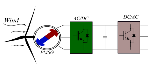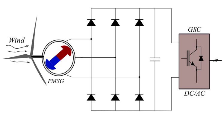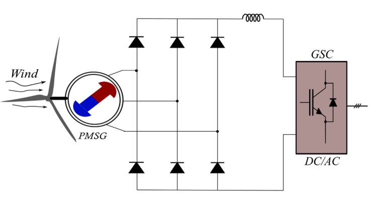 Generador síncrono de imanes permanentes (PMSG): Estos generadores son cada vez más populares en los sistemas de energía eólica contemporánea debido a su alta eficiencia, diseño compacto, y la posible eliminación de la caja de cambios. Utilizan imanes permanentes en el rotor, lo que elimina la necesidad de potencia reactiva en el circuito del rotor y aumenta la eficiencia global. Las PMSG funcionan eficazmente en una amplia gama de velocidades y son especialmente adecuadas para aerogeneradores de velocidad variable. La figura 2 ilustra el sistema de conversión de energía eólica de tipo 4 que utiliza PMSG.