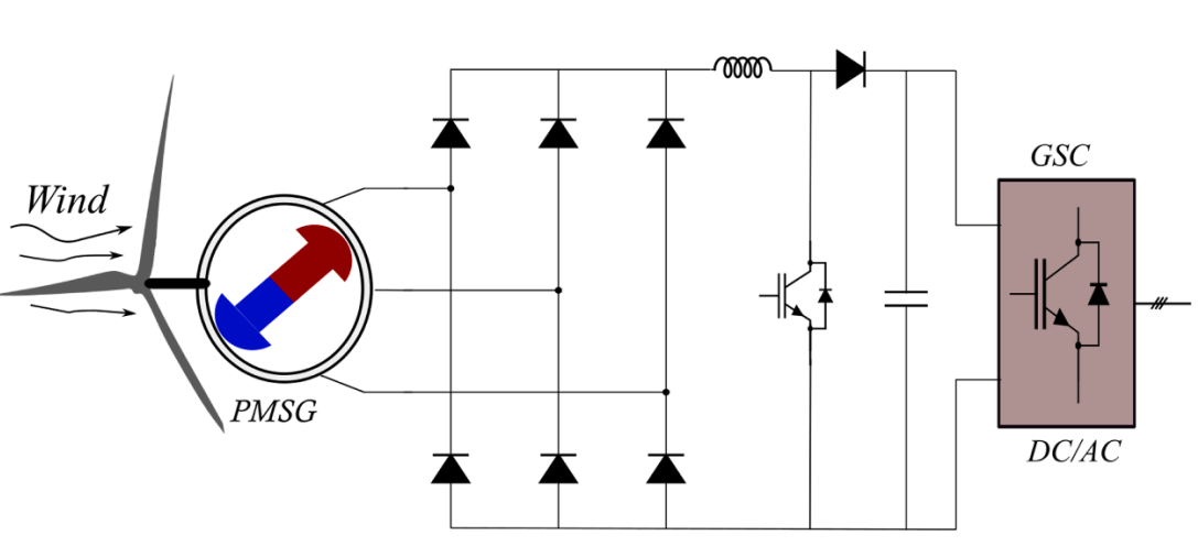 A pesar de su rentabilidad, los rectificadores de puente de diodos tienen notables limitaciones. Entre ellas, la incapacidad para lograr la máxima extracción de potencia del viento y la falta de control sobre la dinámica del aerogenerador y la calidad de la energía. Para subsanar estas deficiencias, se puede introducir un convertidor elevador CC-CC en cascada con un rectificador de diodos, como se muestra en la figura 4. El convertidor elevador CC-CC mejora el rendimiento del sistema al permitir el MPPT, lo que permite un mejor control de la tensión del enlace CC (Rahimi, 2017). Esto proporciona una ventaja adicional al garantizar que la tensión se mantiene por encima de la amplitud de la tensión de red, mejorando así la flexibilidad de control del GSC.