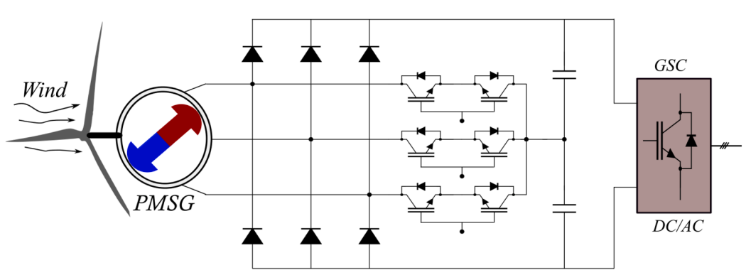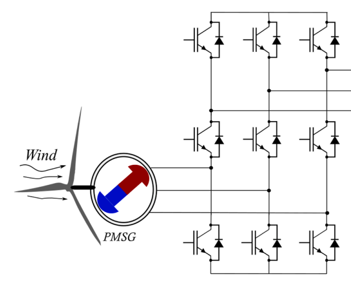 A diferencia de los rectificadores de diodos, los rectificadores controlados de la topología de convertidor de seis interruptores pueden ajustar la tensión continua suministrada a la red modificando la fase y la amplitud de la corriente alterna producida por el aerogenerador. Este control se consigue utilizando interruptores de potencia como tiristores, IGBT o MOSFET. Cuando se integra con un PMSG, esta topología de convertidor proporciona la capacidad de regular parámetros críticos como la velocidad del generador, el factor de potencia y el par electromagnético, todo ello minimizando la distorsión armónica de la corriente.