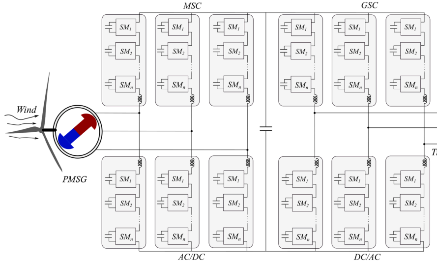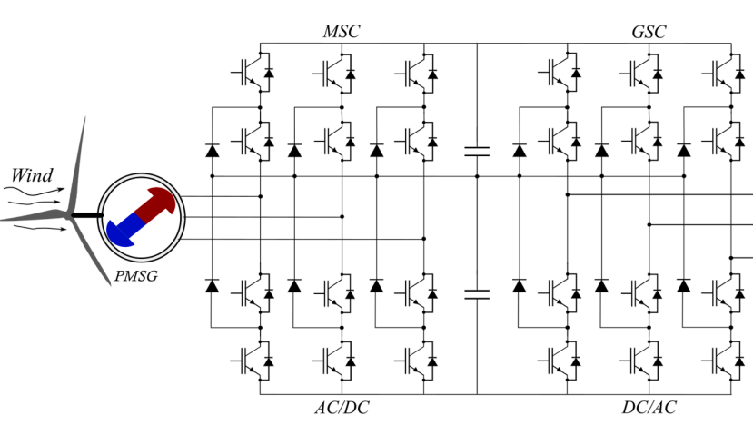 Los convertidores de potencia desempeñan un papel crucial en los sistemas de tipo 4, ya que permiten transformar la salida de frecuencia variable del generador en una frecuencia compatible con la red. En los sistemas basados en PMSG se utilizan con frecuencia convertidores back-to-back de potencia plena, compuestos por un rectificador CA/CC y un inversor CC/CA. Estos convertidores proporcionan una gestión eficaz y adaptable de la potencia de salida, facilitando la integración con la red.