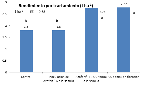 Los mejores rendimientos se obtuvieron donde se aplicó Quitomax® al inicio de floración (tratamiento 4) y combinado con Azofert®-F aplicado a las semillas previo a la siembra (tratamiento 3) con un rendimiento de 2,77 y 2,75 t ha-1 respectivamente.