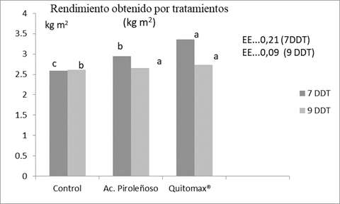 Al evaluar el rendimiento, en el primer experimento (7 DDT) existieron diferencias significativas entre los tratamientos evaluados, reportándose el mayor valor en el tratamiento donde se aplicó Quitomax® y en el segundo experimento (9 DDT) los dos tratamientos donde se aplicaron los bioproductos superan significativamente al tratamiento control, sin diferencias significativas entre ellos.