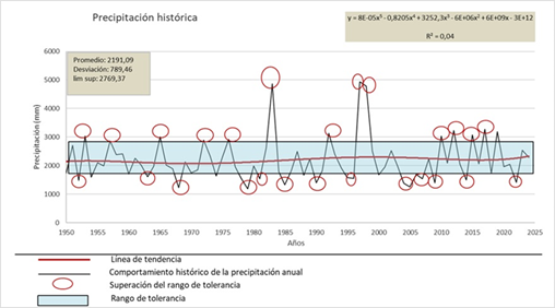 Figura 1. Precipitación histórica en la Estación Experimental Tropical Pichilingue (INAMHI, 1990) (INAMHI, 2024).