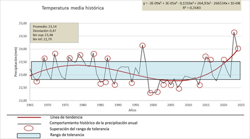 Figura 2. Temperatura media histórica en la Estación Experimental Tropical Pichilingue (INAMHI, 1990) (INAMHI, 2024).