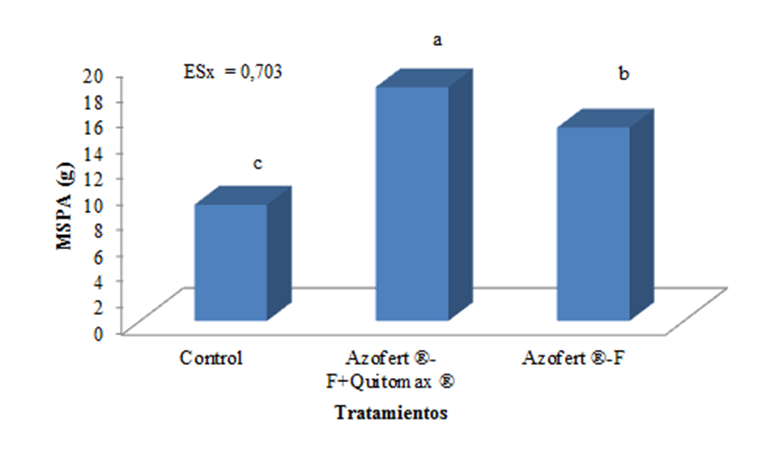 Figura 2. Efecto de los tratamientos sobre la biomasa seca de la parte aérea (MSPA) en plantas de frijol.