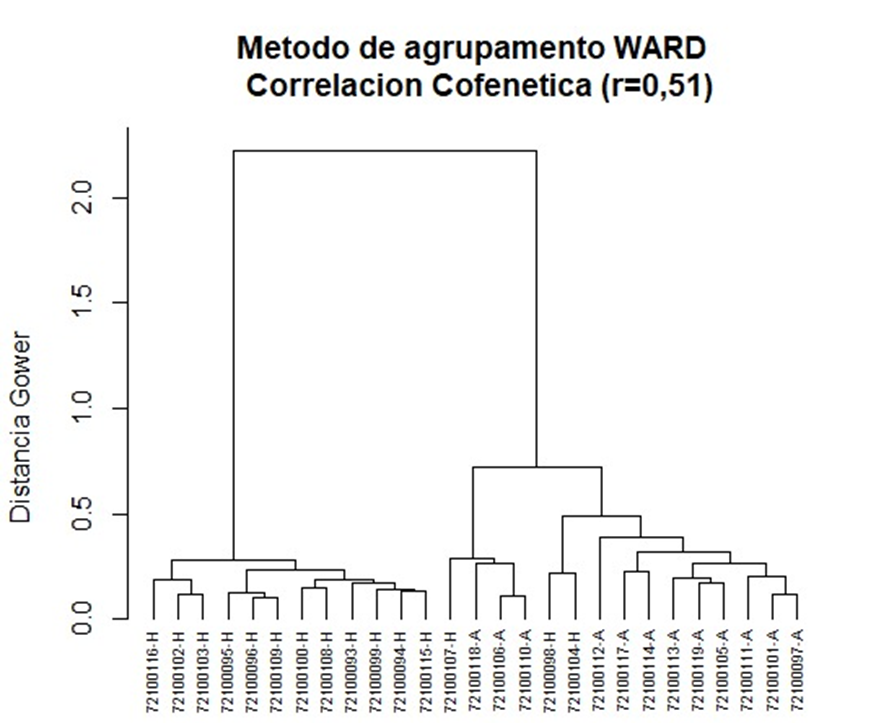 La estructura taxonómica de las entradas representadas por un fenograma, se analizó mediante el agrupamiento jerárquico de Ward (1963), que permite medir la distancia entre grupos para producir las agrupaciones y conformar una representación gráfica en forma de árbol o dendrograma. Se crea el dendrograma para resumir el proceso agrupación y permitir observar los cambios de varianza más significativos (Espinel, 2015). Los agrupamientos de las entradas se formaron con los criterios de Pseudo F y Pseudo t² utilizando el procedimiento de CLUSTER del software estadístico.