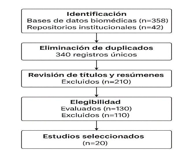 Las bases de datos biomédicas contenían 358 registros, y en los repositorios institucionales se encontraron 42 documentos más. Se conservaron 340 registros únicos tras eliminar 60 duplicados. En el cribado de títulos y resúmenes, 210 artículos fueron excluidos ya que no tratan de forma directa sobre la efectividad y la precisión de las PDR en el laboratorio clínico. En la fase de elegibilidad, se revisaron 130 textos completos, de los cuales se resultaron 110, ya que no cumplían con los criterios de inclusión, como, la falta de información de sensibilidad y especificidad o la ausencia de validación en la vida real. Finalmente, se escogieron 20 estudios para un análisis detallado de los resultados (Figura 1).