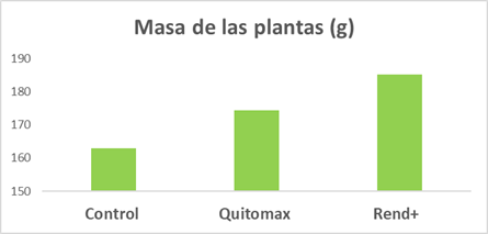 Con relación a la masa fresca de las plantas evaluadas en el momento de la cosecha, en la figura 1 se aprecia que existieron diferencias significativas entre los tres tratamientos evaluados, obteniéndose los mayores valores donde se aplicó Rend+, seguido del tratamiento al cual se aplicó Quitomax® y el valor más bajo lo obtuvo en el tratamiento control.
