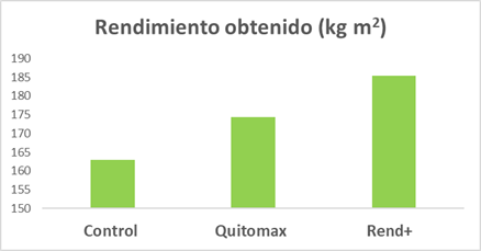 González (2020), estima en base a los resultados, un rendimiento promedio de 4,3 kilogramos por metros cuadrado de superficie para el tratamiento T1, los cuales son superiores a los obtenidos en el tratamiento control y donde se aplicó Quitomax® e inferior al resultado donde se aplicó Rend+.