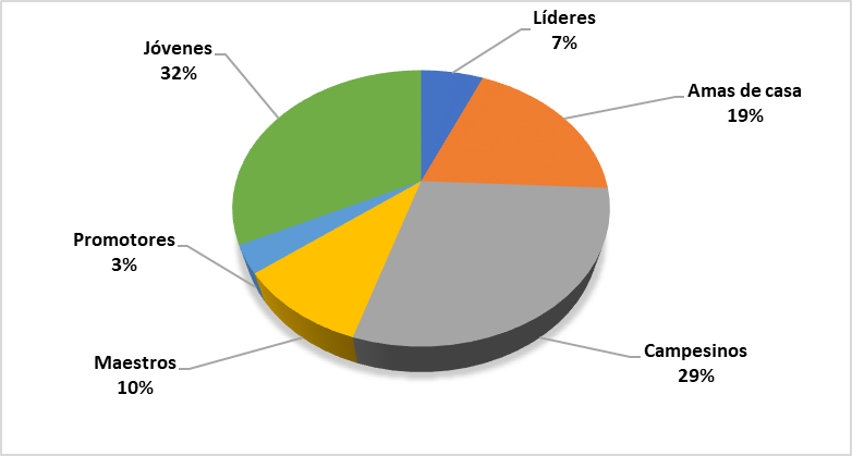 Resulta promisorio (Figura 2), el hecho de que los jóvenes encabezaran el mayor por ciento de participación, con un 32 %, puesto que las jóvenes generación desempeñan el rol protagónico en cuanto a la continuidad de la transmisión del amor a la naturaleza y conducta responsable o amigable con el medio ambiente en el tiempo. De igual manera se considera positivo, el porciento de participación de campesinos y ama de casa, representando el 29 % y 19 % de las personas adultas mayores de la comunidad, lo que denota interés por conocer y contribuir en la conservación de los valores naturales de la localidad. La participación del resto de los implicados fue menor, en cuanto al por ciento que representan del total de personas adultas de la comunidad. Pero en sí, representan la totalidad de personas implicadas, en cada una de las funciones que desempeñan, dígase toma de decisiones en el caso de los lideres o dirigentes y de la promoción cultural y educación en el caso de los promotores culturales y maestros.