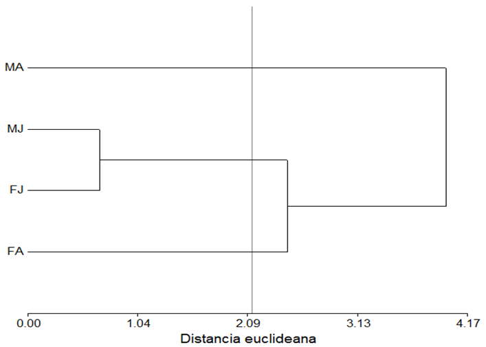 El dendograma del análisis de conglomerados (Figura 1) demostró que las personas jóvenes de ambos sexos (FJ y MJ) forman un grupo, o que hay similaridad en las respuestas a las cinco preguntas entre ellos, tal vez debido a una mayor movilidad dentro de la zona objeto de estudio, mientras que los adultos de ambos sexos (MA y FA) poseen un conocimiento divergente con relación al conocimiento de la especie.