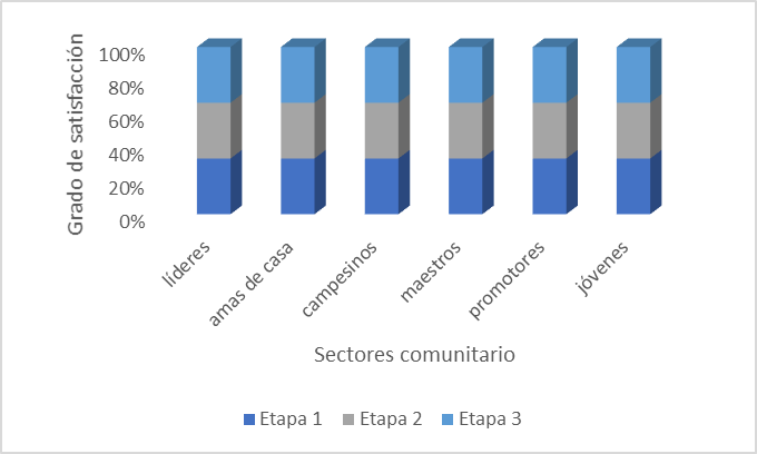 Las actividades comprendidas en las Etapas 1 y 2 se desarrollaron exitosamente, con la participación de pobladores, (personas naturales adultas que representan diferentes sectores en la comunidad). Lo que se considera alentador como punto de partida, teniendo en cuenta que cada uno de ellos, resulta decisivo en el estudio partiendo de su implicación en el desarrollo de las actividades, que dan cumplimiento a las etapas y las acciones de extensión en general. Los comunitarios son un componente esencial dentro del proceso de extensión. Son ellos el punto de partida y los principales beneficiados de todas las intervenciones extensionistas que se desarrollan, y son ellos los que aportan los elementos necesarios para que el extensionista se retroalimente y pueda perfeccionar el proceso (Castillo-Arrebato et al. 2021).