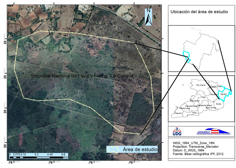 El área de estudio se ubica entre los 20.32 y 20.34 grados de latitud norte y entre los 76.48 y 76.50 grados de longitud oeste. En el consejo popular Cautillo perteneciente al municipio Jiguaní de la provincia Granma. La figura 1 muestra el límite del área ocupada por la Empresa Nacional para la protección de la Flora y la Fauna La Colonia.