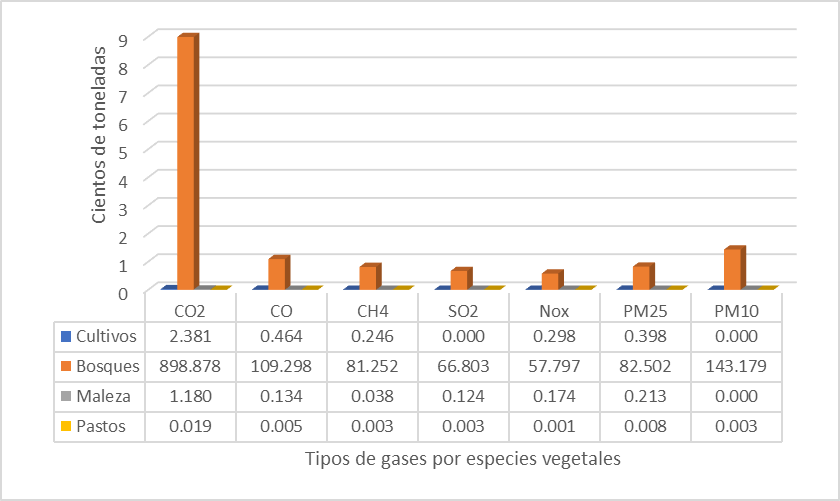 En correspondencia con la magnitud de las áreas y la biomasa quemada por tipo de vegetación la mayor emisión de gases y partículas está dada por la vegetación de tipo bosques. Le sigue las emisiones por quema de áreas de cultivos que, unido a la anterior, sumaron más del 99% de las emisiones de gases y partículas a la atmósfera (Figura 3).
